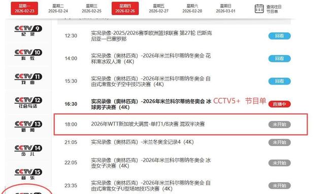 抖音短视频:《@咪咕体育——#2027男篮世预赛 杨鸣:今晚就是生死战!#中国男篮vs日本男篮男篮世预赛》2026年2月26日抖音短视频:《@北京日报——背水一战!中国男篮今晚18时05分将客场对战日本队》2026年2月26日抖音短视频:《@北京时间——2月24日,2026WTT新加坡大满贯女单1/16决赛,王曼昱3-1战胜郑怡静,晋级16强。赛后采访中肯定了对手郑怡静的发挥,下一轮王曼昱将对战韩国选手申裕斌。》2026年2月24日新浪微博:《@WTT大满贯》央视网:《节目单-CCTV节目官网》