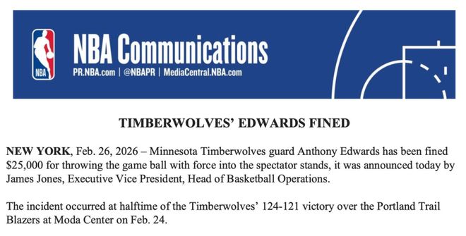 北京时间2月27日,NBA篮球运营执行副总裁詹姆斯-琼斯今日宣布,森林狼后卫爱德华兹和魔术后卫贝恩都因用力将比赛用球扔向观众席,各被罚款25000美元。