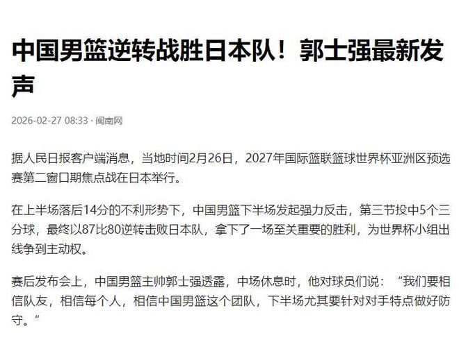 此次战胜日本队,不仅挽回了中国男篮的风评,也让郭士强的风评得到扭转。