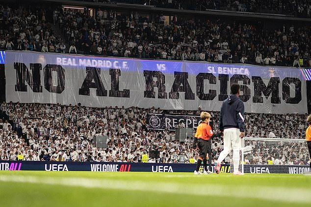 周三,在圣地亚哥・伯纳乌球场的赛前展示环节中,现场还悬挂了巨大的“反对种族主义”横幅,看台上一名球迷却被拍到做出相关手势。